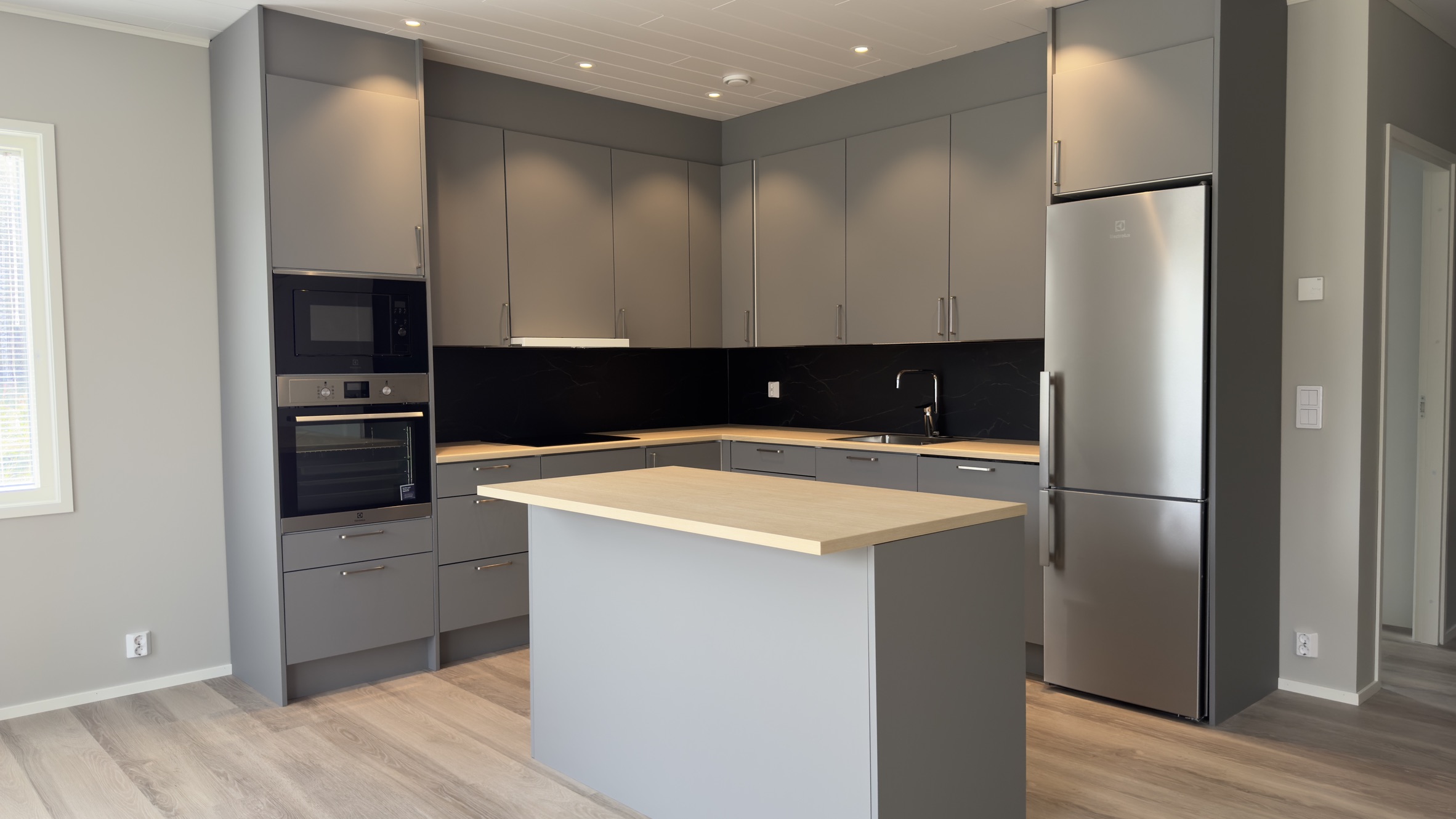 Nyproducerad gavellägenhet om 70 kvm med tillhörande uteplats och carport. Modernt och stilfullt inredd i ljusa toner med kök och inredning från finska Stark-kök.